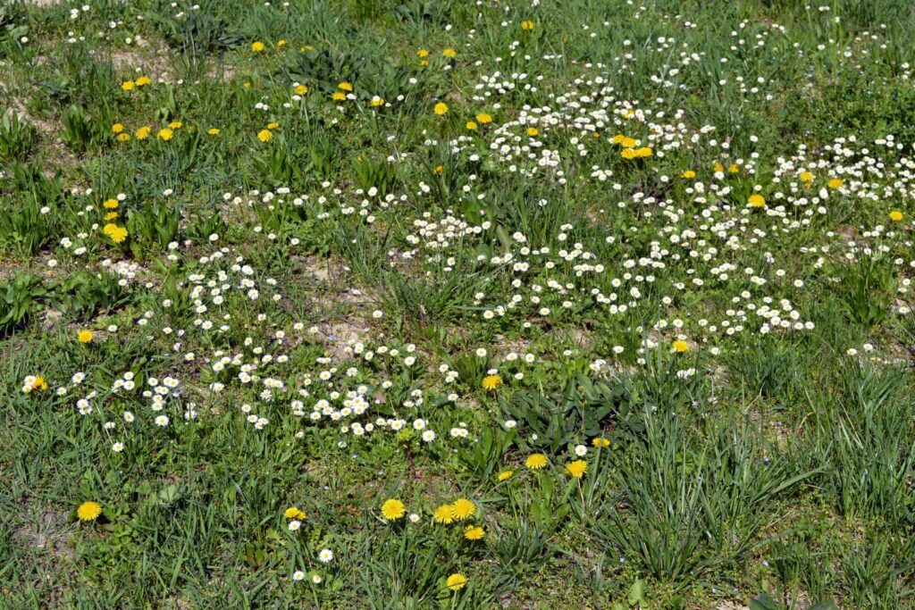 Associate ad esse nelle zone marginali più asciutte dei prati spesso si riscontrano vistose margherite (Leucantheum vulgare), le umili pratoline (Bellis perennis), la profumata achillea (Achillea millefolium), i calici rigonfi della silene (Silene vulgaris), qua e là i cespi del caglio bianco (Gallium album) e del caglio zolfino (Gallium verum), lo sferracavallo (Hippocrepis comosa). Nei luoghi con un maggior tasso di umidità sbocciano in abbondanza le corolle dorate del tarassaco (Taraxacum officinalis), i racemi azzurri dell’ajuga (Ajuga reptans), gli irritanti ranuncoli (Ranunculus acris, Ranunculus bulbosus), le spighe azzurre della salvia (Salvia pratensis), la vulneraria (Anthyllis vulneraria), l’olmaria (Filipendula olmaria).