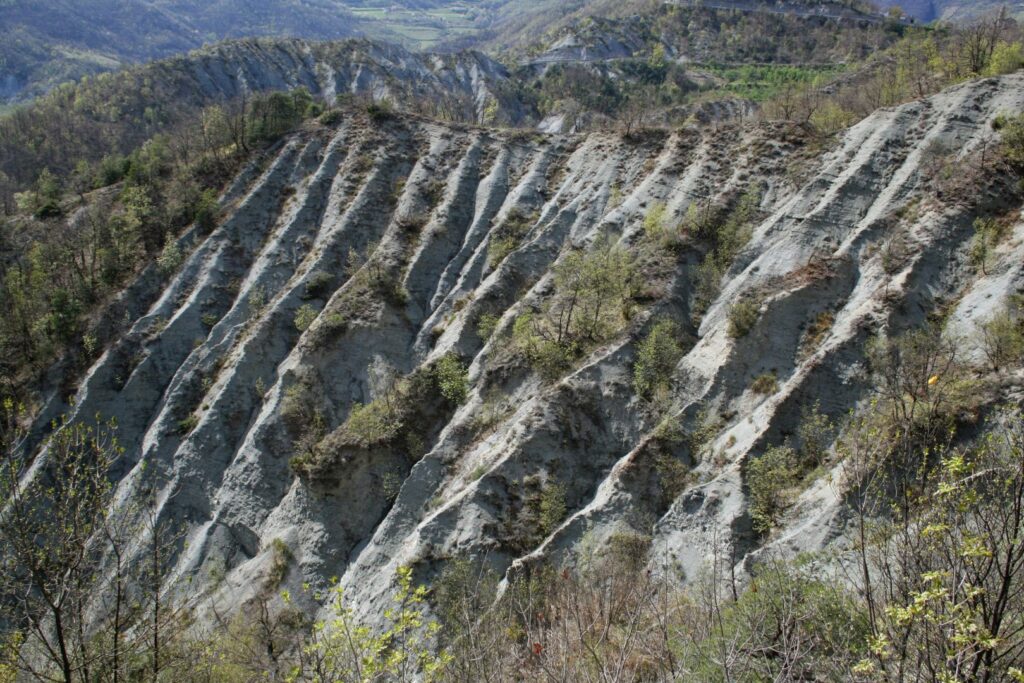 Argille azzurre (Pliocene inferiore“Zancleano”: da 5,3 a 3,8 milioni di anni): deposito costituito da argille azzurro-grigiastre compatte e alquanto resistenti alla disgregazione con abbondante presenza di fossili marini, formatesi in un mare poco profondo, presenti in una fascia frastagliata attigua ai depositi Messiniani.