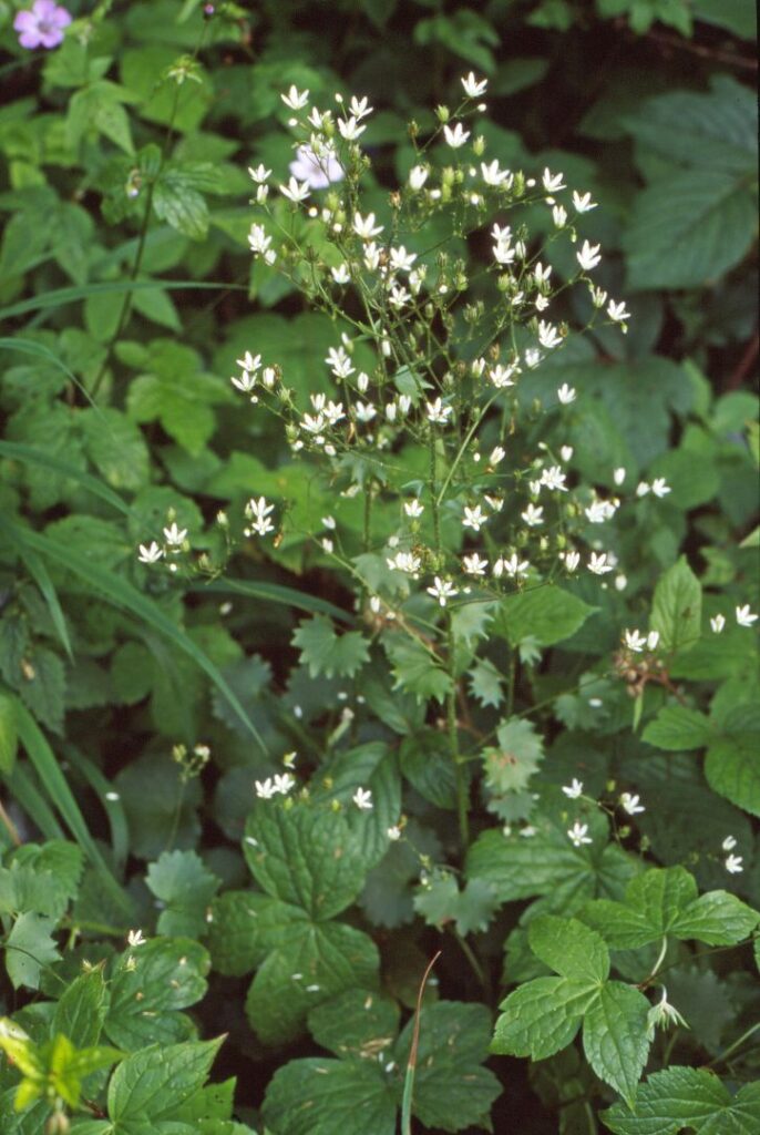 Sassifraga a foglie rotonde. Altezza 30-60 cm.