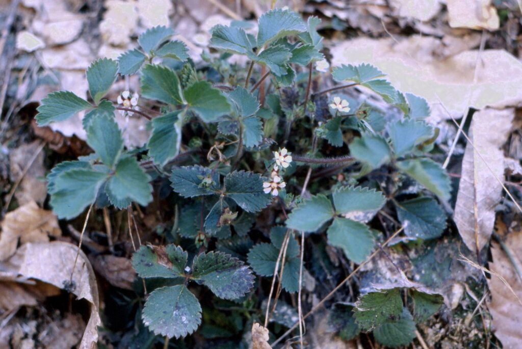 Pianta erbacea con stoloni. Scapi ascendenti flessibili, picciolo lungo 5-10 cm. Foglie erette, pelose, divise in 3 segmenti ellittici, dentati. Fiori diam 1,5-2 cm, petali bianchi, posti all’apice dello scapo. Frutto sferico diam 1-2 cm, rosso, edule, profumato.