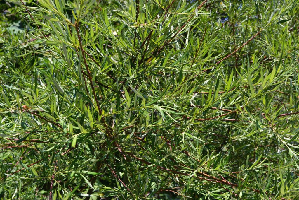 Albero o arbusto (sp. dioica) di medie dimensioni. Rami giovani pubescenti, grigiastri. Foglie alterne, lineari, larghe 1 cm con bordi paralleli e apice acuto, verde-scuro e lucide nella pagina superiore, coperte di peluria biancastra nella pagina inferiore, margine fogliare ripiegato verso il basso, dentato e ondulato. Gattini maschili oblunghi, stretti, di colore giallognolo.